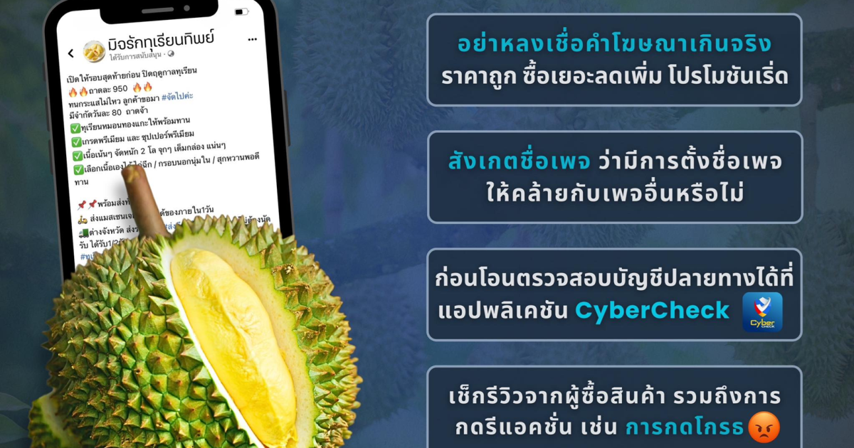 เข้าสู่ช่วงเทศกาลผลไม้เมืองร้อน “ทุเรียน” ผลไม้ยอดนิยมที่หลายคนรอคอย นอกจากรสชาติจะอร่อยแล้ว ผู้บริโภคต้องระวัง “เพจปลอมหลอกขายทุเรียน” ซึ่งมิจฉาชีพมักจะใช้โอกาสนี้เป็นช่องทางในการหลอกลวงอีกทางหนึ่งด้วย