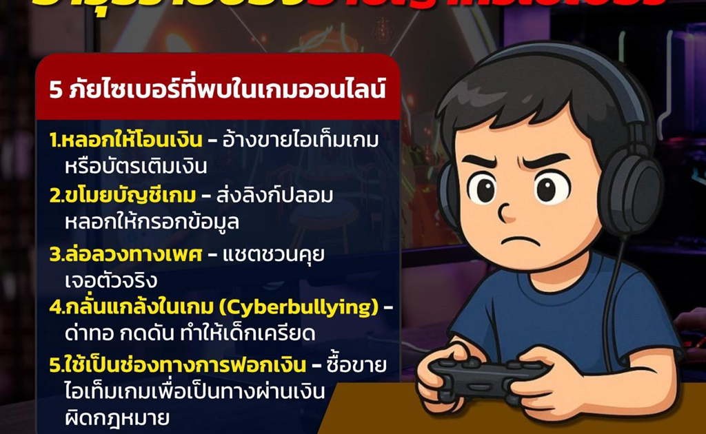 ในช่วงปิดเทอม เด็กและเยาวชนมักใช้เวลาว่างไปกับการเล่นเกมออนไลน์ ซึ่งอาจกลายเป็นช่องทางให้มิจฉาชีพแฝงตัวเข้ามาสร้างความสนิทสนม ผ่านการเล่นหรือแชตในเกม ก่อนหลอกลวงในรูปแบบต่างๆ ผู้ปกครองจึงควรหมั่นสังเกต ตรวจสอบบทสนทนา พฤติกรรมการเล่นเกม และคอยแนะนำบุตรหลานอย่างใกล้ชิด