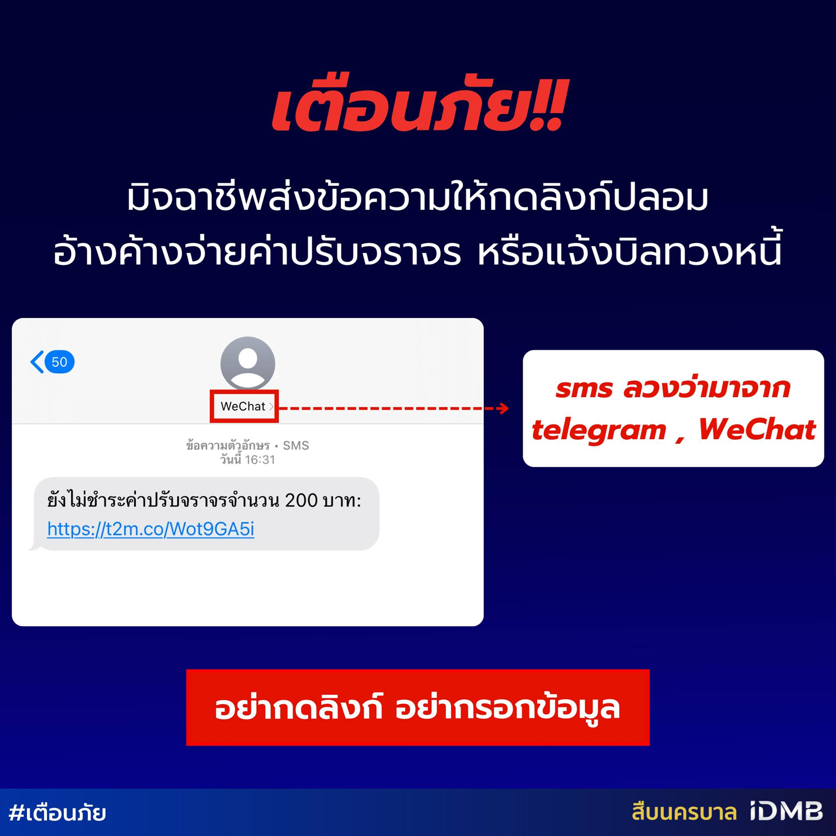 เตือนภัย!! มิจฉาชีพส่งข้อความให้กดลิงก์ปลอมอ้างค้างจ่ายค่าปรับจราจร หรือแจ้งบิลทวงหนี้.ส่งข้อความแจ้