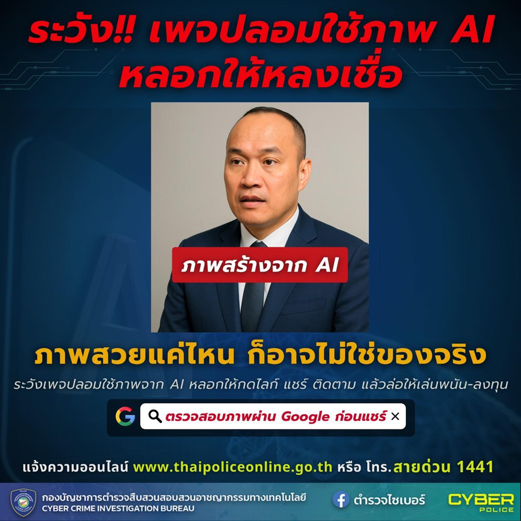 ระวัง! เพจปลอมใช้ภาพ AI หลอกให้หลงเชื่อ ตรวจสอบได้ผ่าน Google ก่อนตกเป็นเหยื่อ.มิจฉาชีพยุคใหม่ใช้ ภา